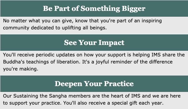 Dana, or generosity, is a sincere form of practice that opens our heart to ourselves and to others. Joining Sustaining the Sangha is an opportunity to cultivate this beautiful heart quality while nourishing our IMS community, helping us to care for our teachers and centers while keeping retreat fees affordable.